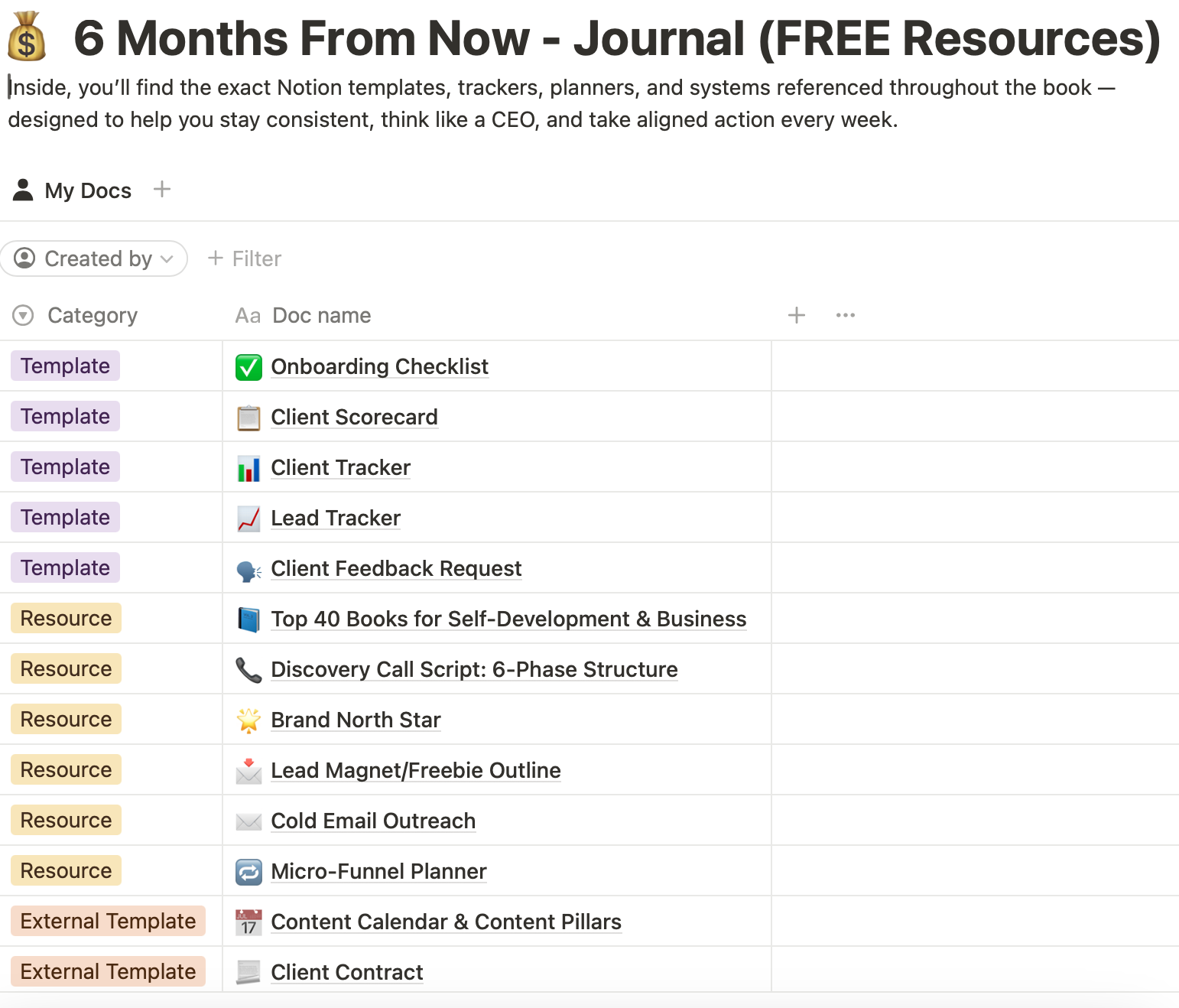 This is your private access point to the full 6 Months From Now resource library. Inside, you’ll find the exact Notion templates, trackers, planners, and systems referenced throughout the book — designed to help you stay consistent, think like a CEO, and take aligned action every week.